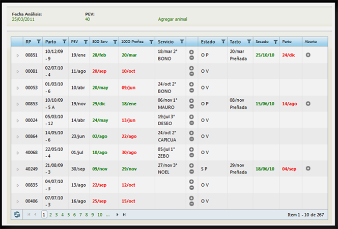 Estos eventos se puden cargar en forma individual o mediante una grilla donde se puede obtener una visión rápida del estado del animal con indicadores como la fecha de parto, el período de espera voluntario, fecha de último servicio y número de servicio, etc. El sistema también permite obtener un historial de todos los eventos del animal.