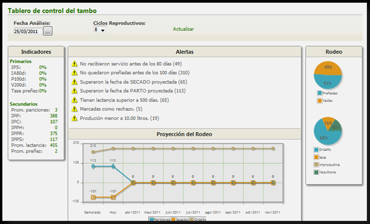 - Indicadores: porcentaje de preñez en el primer servicio, porcentaje de vacas inseminadas, vacas vacías y preñzadas, promedio de pariciones, IPP, IPC, IPPR, promedio de lactancia, promedio de preñez, etc.